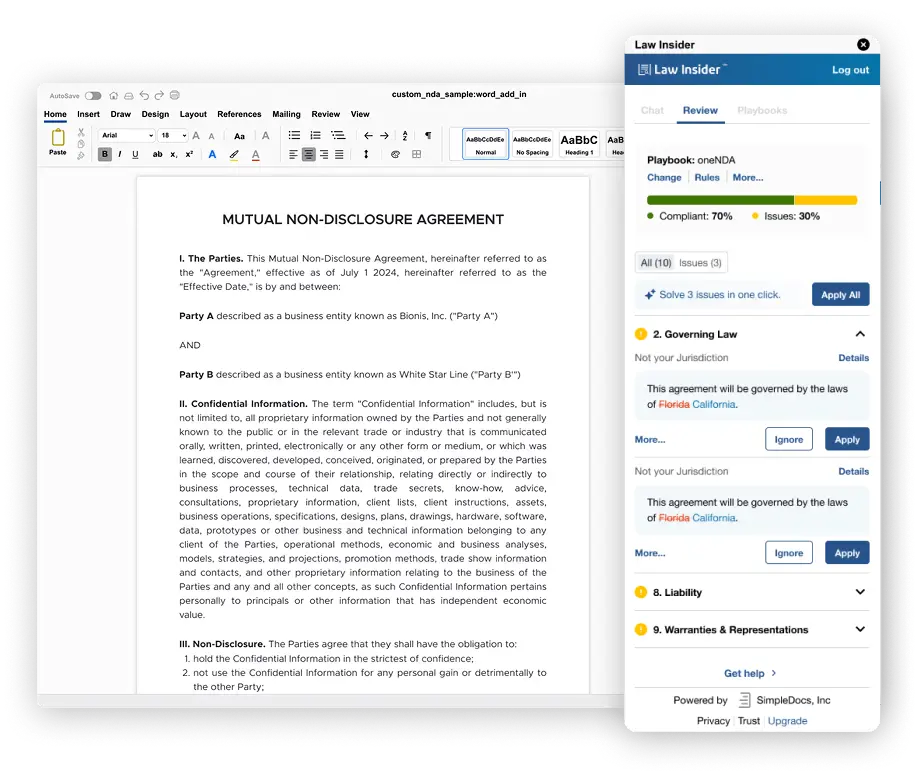 Discover how Telos Labs worked with Law Insider and SimpleDocs to integrate real-time AI-powered contract review, drafting and redlining capabilities, right inside the platform lawyers already use: Microsoft Word. The result? A powerful, affordable upgrade for solo practitioners, law firms and in-house counsel.